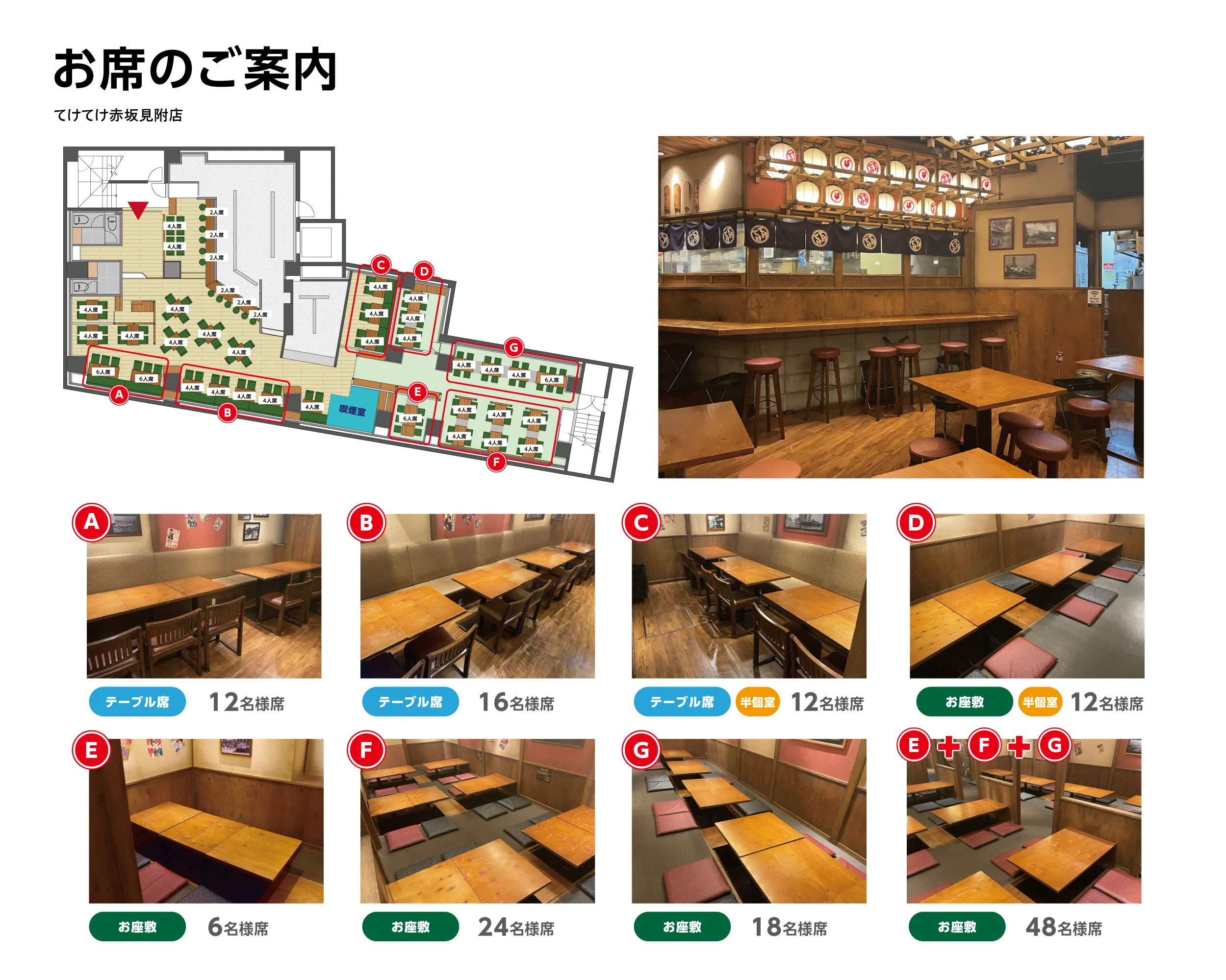 カウンター席テーブル席ボックス席個室半個室座敷