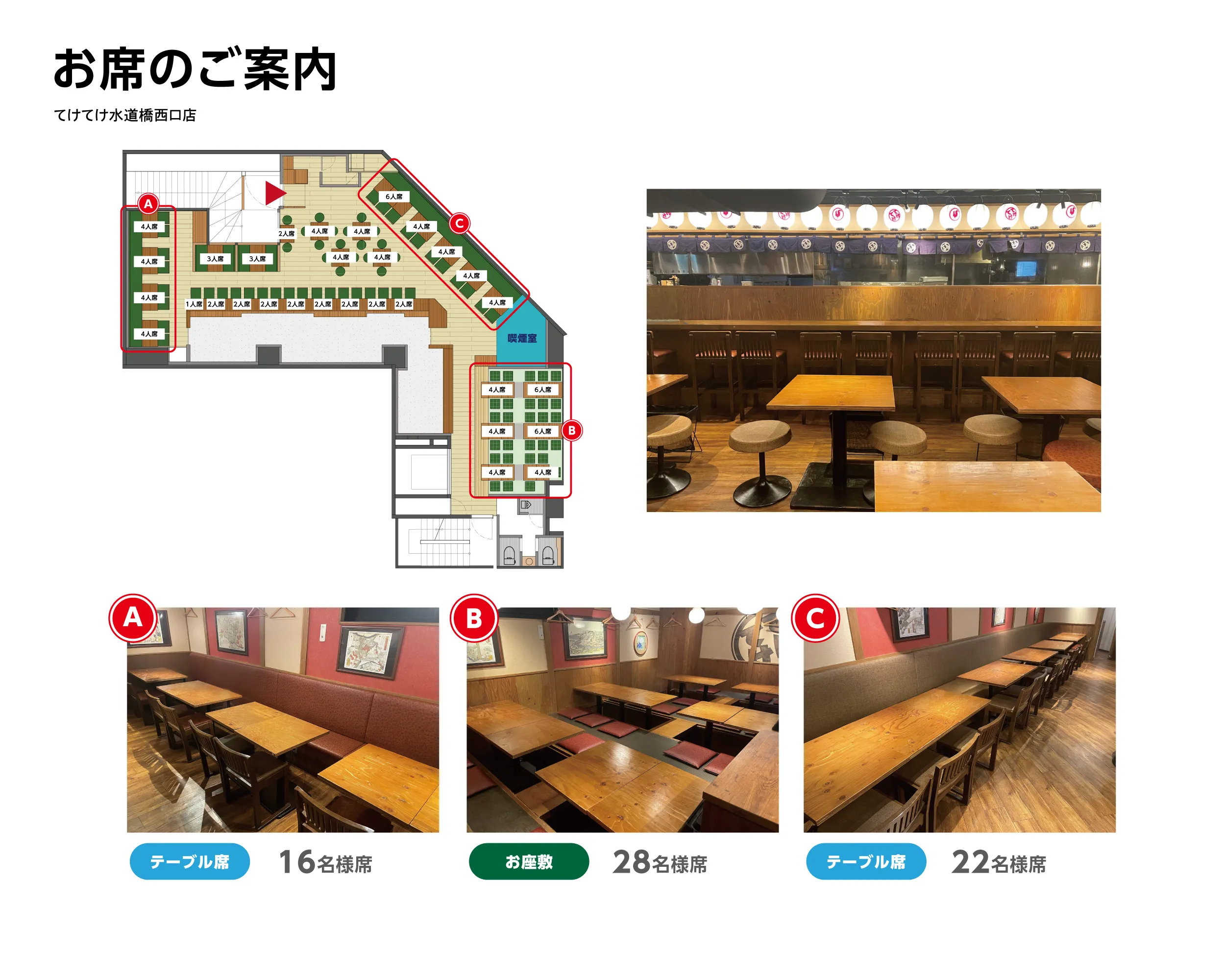 カウンター席テーブル席ボックス席個室半個室座敷