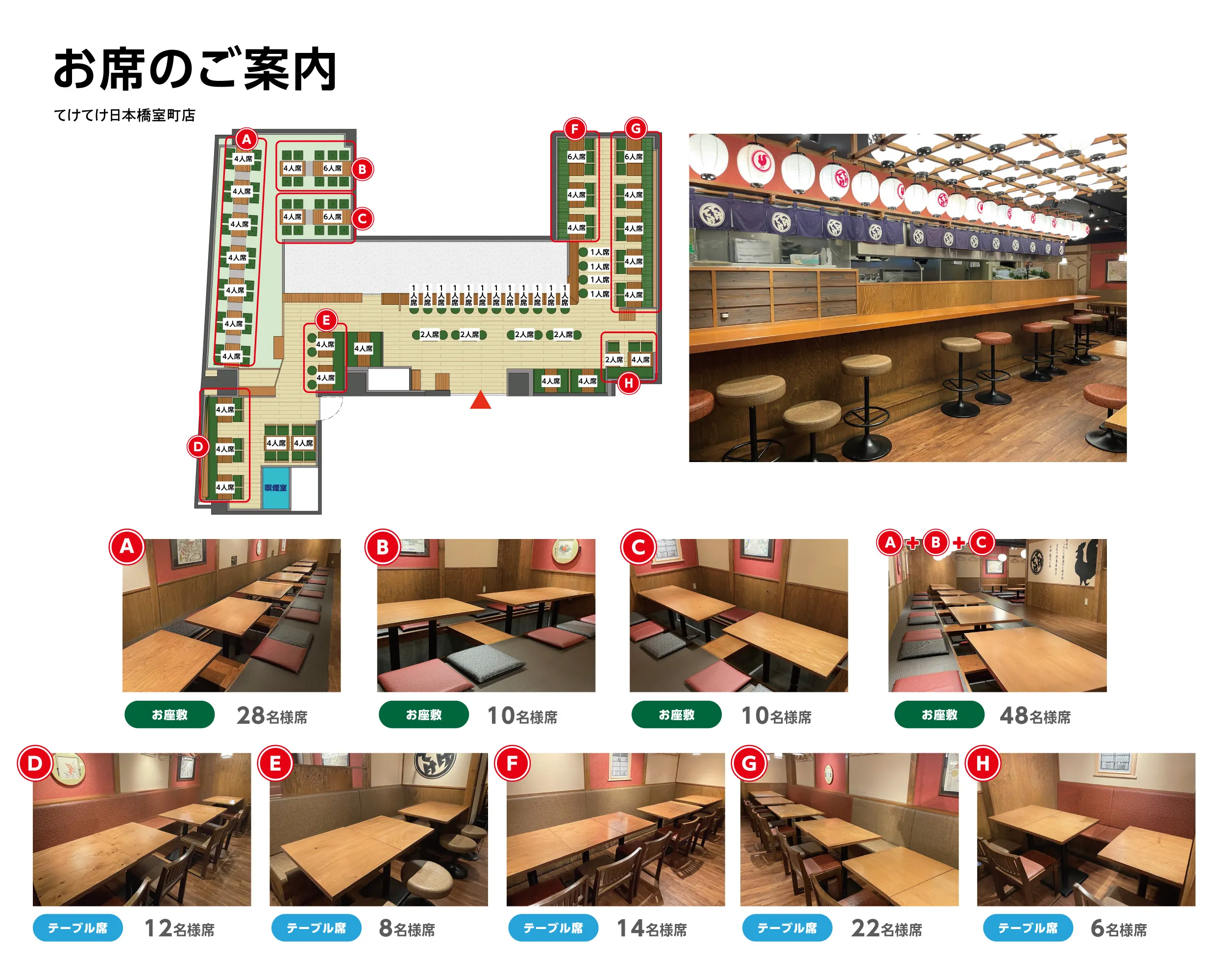 カウンター席テーブル席ボックス席個室半個室座敷